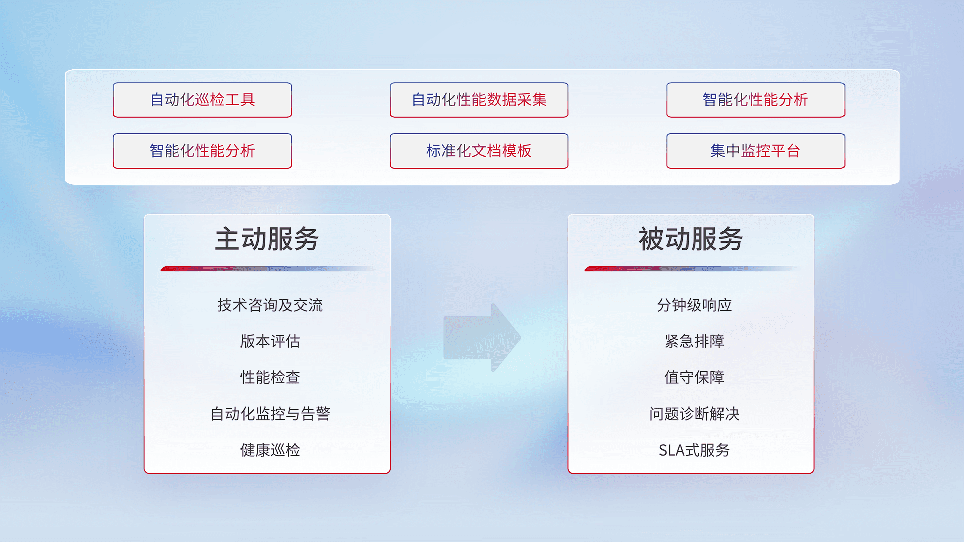 智能化工具和标准化文档,,,,保障服务质量,,,,提供主动服务(包含技术咨询、、版本评估、、、、性能检查、、自动化监控与告警、、、、健康巡检)和被动服务包含(分钟级响应、、、、紧急排障、、值守保障、、问题诊断解决、、、SLA服务)。。